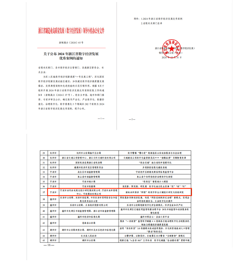 近日,浙江省經(jīng)濟(jì)和信息化廳發(fā)布《2024年浙江省數(shù)字經(jīng)濟(jì)優(yōu)秀案例擬確定名單》并完成公示,我院與寧波市水庫(kù)管理中心、寧波原水有限公司聯(lián)合申報(bào)的“面向水庫(kù)防洪‘四預(yù)’的數(shù)字孿生關(guān)鍵技術(shù)研究與系統(tǒng)研發(fā)”案例成功入選。