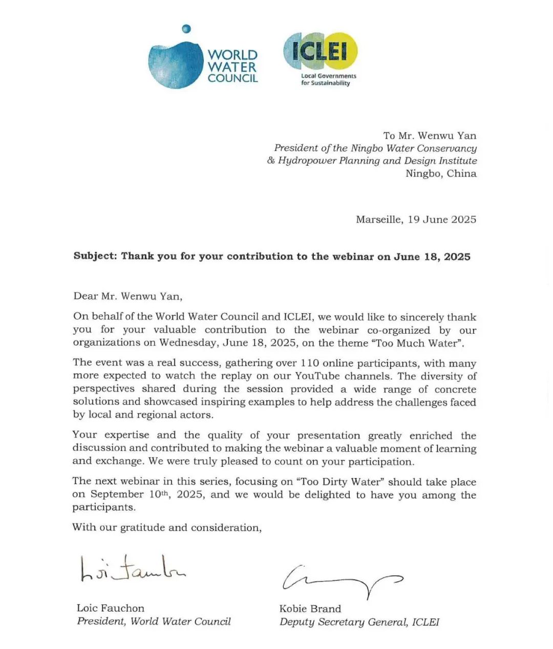 研討會(huì)圓滿(mǎn)落幕后,世界水理事會(huì)特向嚴(yán)文武院長(zhǎng)發(fā)來(lái)感謝信,并盛情邀請(qǐng)其參加下一屆研討會(huì)。