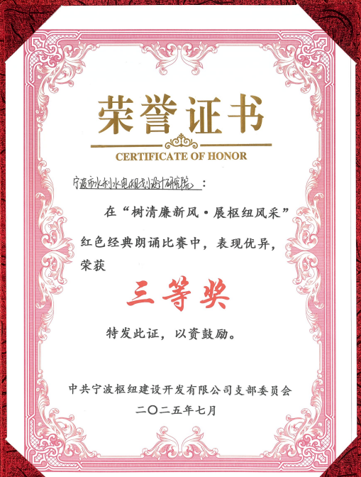 為慶祝中國共產(chǎn)黨成立104周年,2025年7月1日,寧波樞紐建設開發(fā)有限公司隆重舉行了“紅動樞紐·同心共建”迎“七一”主題黨建活動。作為寧波樞紐片區(qū)重要參建單位和黨建聯(lián)盟成員,我院黨總支書記、副院長王洪霞帶隊參與了本次活動,并且,我院兩位青年職工攜選送作品在“樹清廉新風·展樞紐風采”樞紐片區(qū)紅色經(jīng)典朗誦比賽中榮獲三等獎。