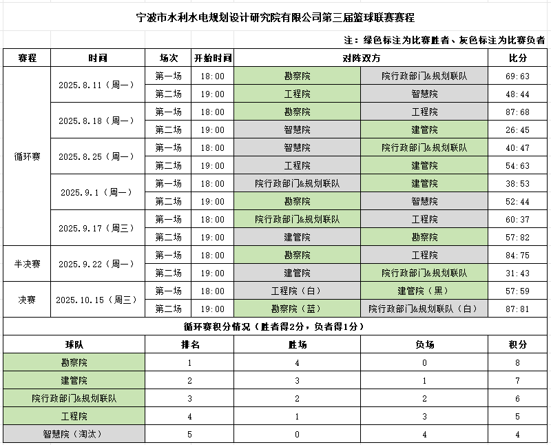 八月盛夏,激情點(diǎn)燃。寧波市水利院第三屆"智慧杯"職工籃球聯(lián)賽在集士港體育公園籃球場火熱開幕!這不僅是一場競技的較量,更是一次寧波院人團(tuán)結(jié)拼搏、斗志昂揚(yáng)的集中展現(xiàn)。經(jīng)過兩個月的鏖戰(zhàn),最終勘察院隊強(qiáng)勢問鼎冠軍,建管院隊與院行政部門&規(guī)劃聯(lián)隊分別獲得亞軍、季軍。現(xiàn)在,就讓我們一同回顧這段充滿汗水與激情的籃球時光!