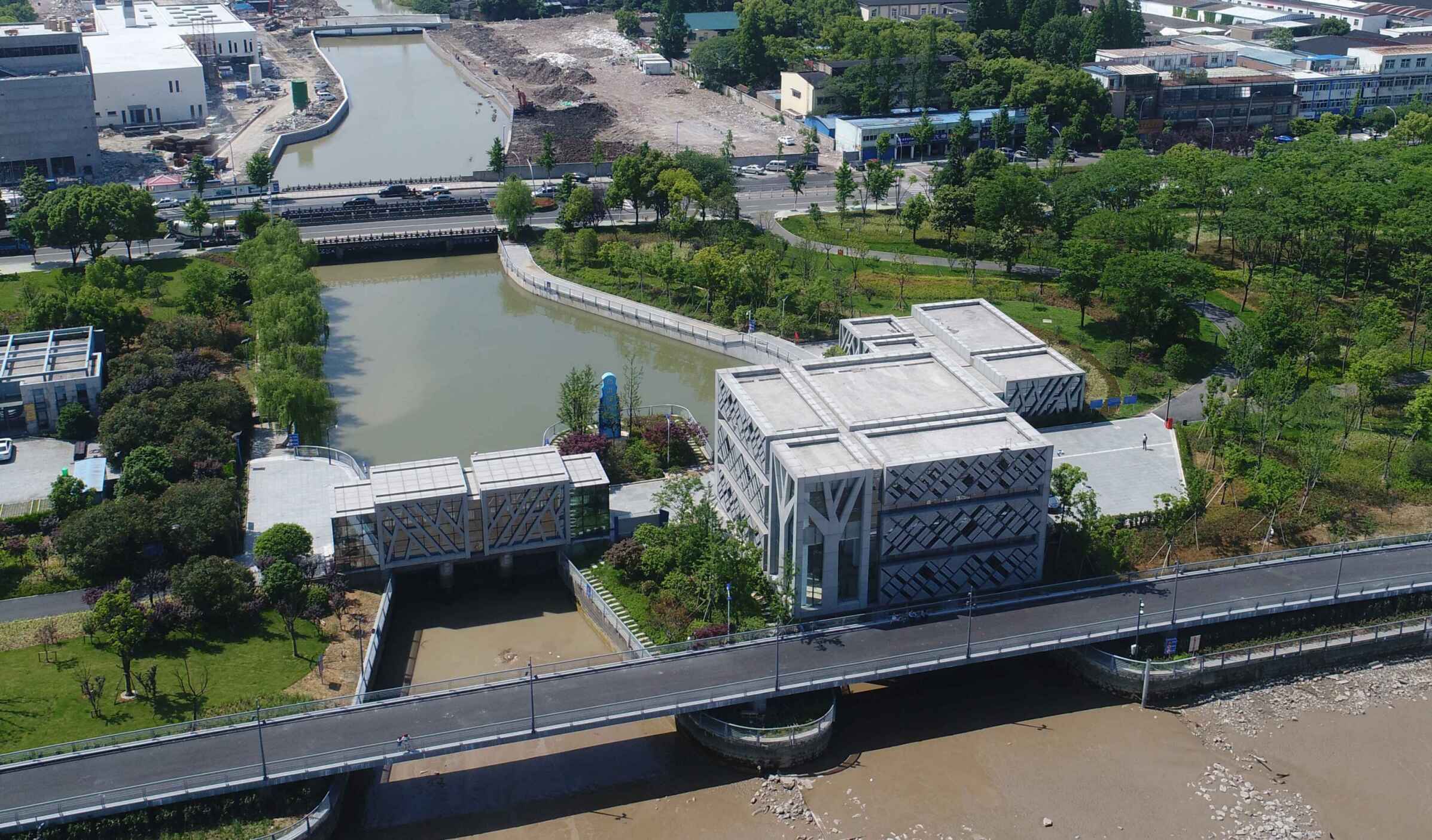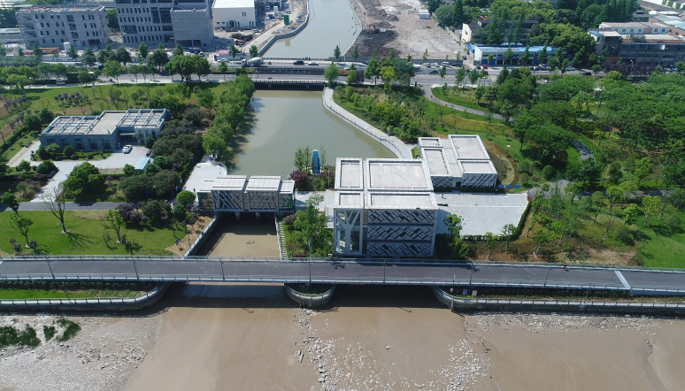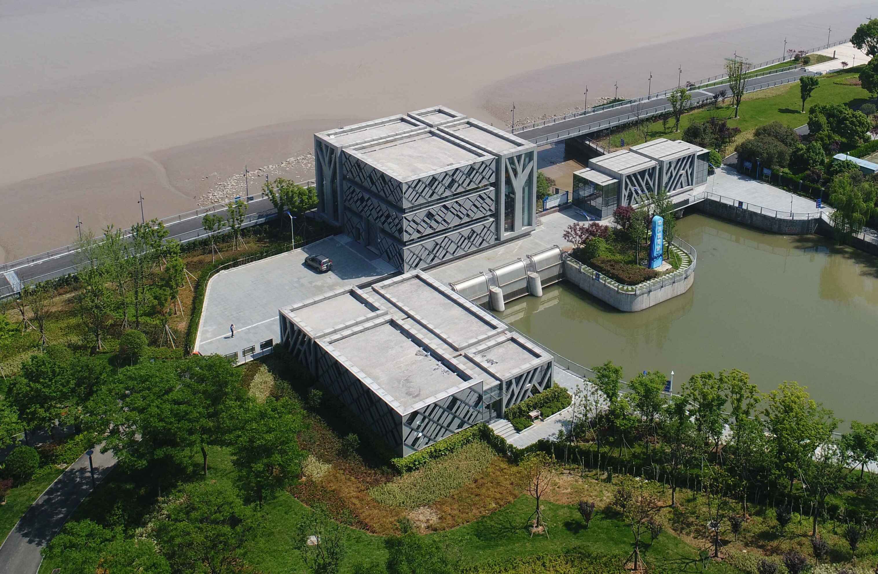 工程通過抽象手法,將樹、落葉等元素融入到建筑表情之中,從而閘站更像是沿江公園里面的雕塑,通過虛實(shí)的結(jié)構(gòu)處理,弱化了高大廠房結(jié)構(gòu)的厚重感。