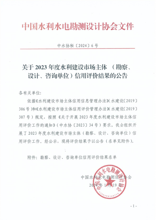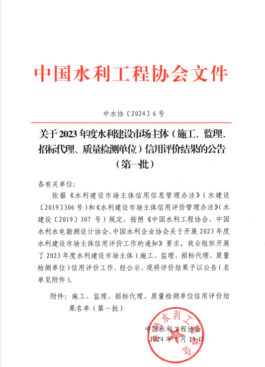 近日,中國水利工程協(xié)會(huì)《關(guān)于2023年度水利建設(shè)市場主體(施工、監(jiān)理、招標(biāo)代理、質(zhì)量檢測單位)信用評(píng)價(jià)結(jié)果的公告(第一批)》(中水協(xié)〔2024〕6號(hào))、中國水利水電勘測設(shè)計(jì)協(xié)會(huì)《關(guān)于2023年度水利建設(shè)市場主體(勘察、設(shè)計(jì)、咨詢單位)信用評(píng)價(jià)結(jié)果的公告》(中水協(xié)秘〔2024〕6號(hào))、《關(guān)于2023年度全國水利水電勘測設(shè)計(jì)行業(yè)信用評(píng)價(jià)結(jié)果的公告》(中水協(xié)秘〔2024〕7號(hào))發(fā)布。